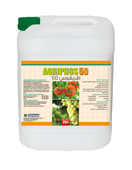 AGRI-PHOS 50 est un engrais liquide à base d’acide phosphorique. Il renferme 50% H3PO4. Il est utilisé dans la fertilisation en goutte à goutte. Il aide à surmonter le froid et à résister aux maladies. AGRI-PHOS 50 contribue essentiellement aux apports de phosphore (stimulation de l’activité racinaire) et à l’acidification de l’eau d’irrigation, favorisant ainsi la mobilité des macro et micro éléments présents dans le sol.