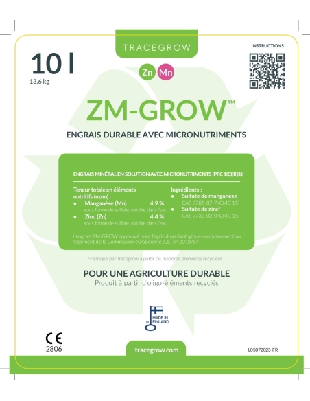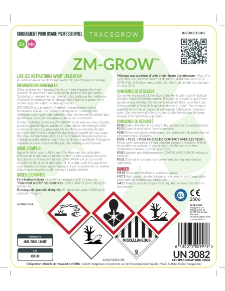 ZM GROW : Est un concentré utilisé principalement pout la fertilisation foliaires les mélanges d’engrais et l’enrobage des semences il est également utiliser pour corriger les fautes carences en manganèse, zinc et soufre.